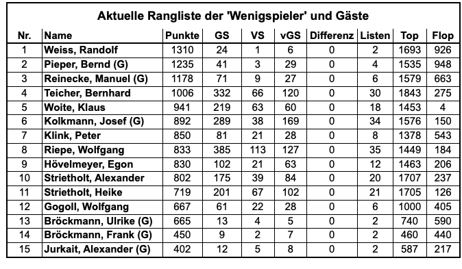 Rangliste der Wenig- und Gastspieler