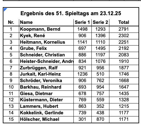 Die Klubmeisterschaft findet im Kalenderjahr von Januar bis Dezember statt. Jedes Mitglied, das in der Saison mindestens 50% aller Serien gespielt hat, kommt in die Meisterschaftswertung. Maßgebend ist der Durchschnitt aller gespielten Listen.