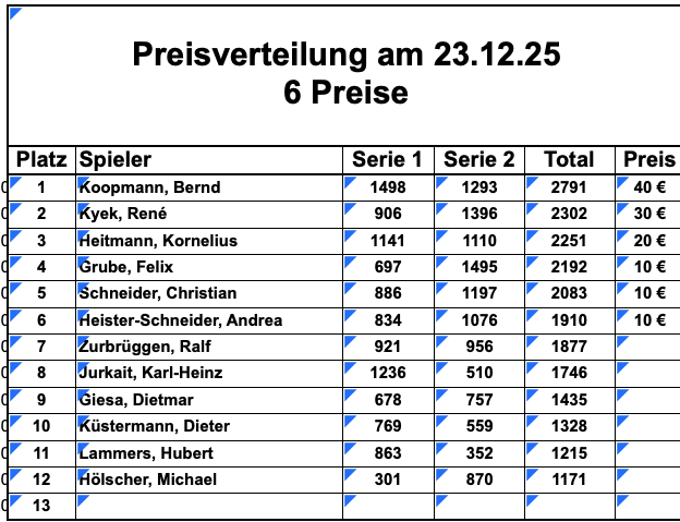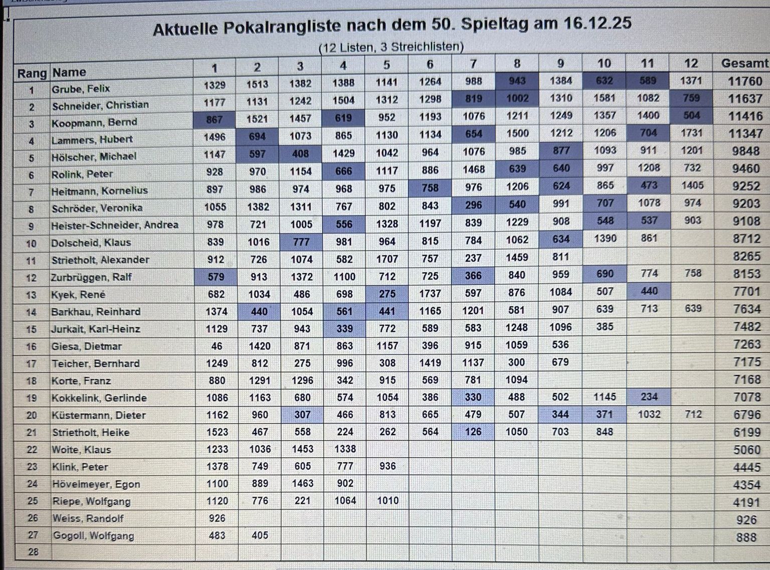 Pokalturnier: Neben der Klubmeisterschaft spielen wir auch einen Poklasieger aus. Die erste im Monat gespielte Liste ist die Pokalliste. Von den max. 12 Listen kommen die besten neun in die Wertung.