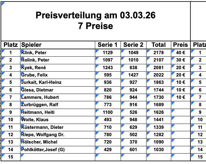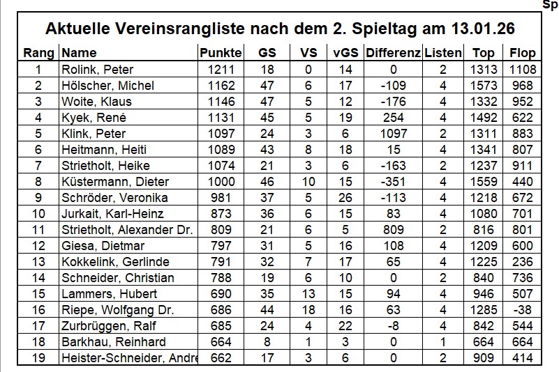 Die Klubmeisterschaft findet im Kalenderjahr von Januar bis Dezember statt. Jedes Mitglied, das in der Saison mindestens 50% aller Serien gespielt hat, kommt in die Meisterschaftswertung. Maßgebend ist der Durchschnitt aller gespielten Listen.