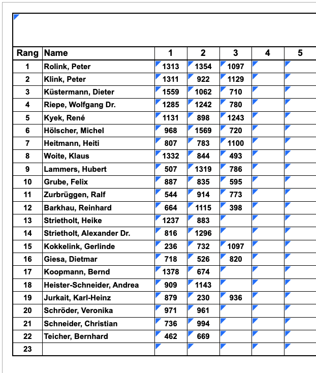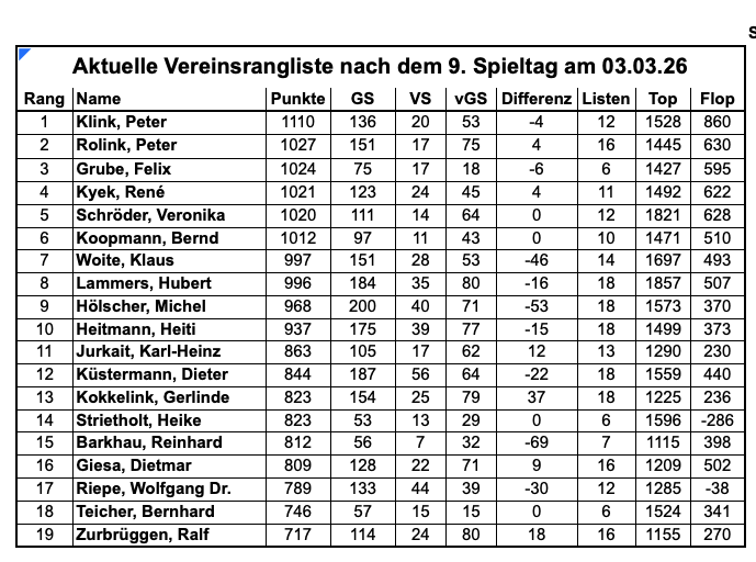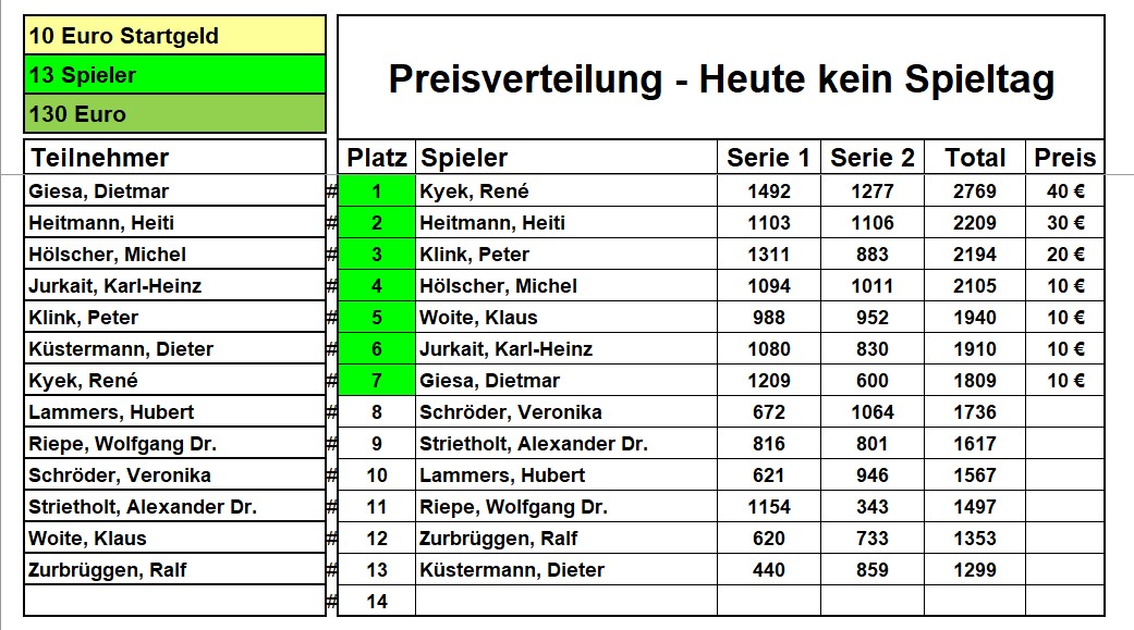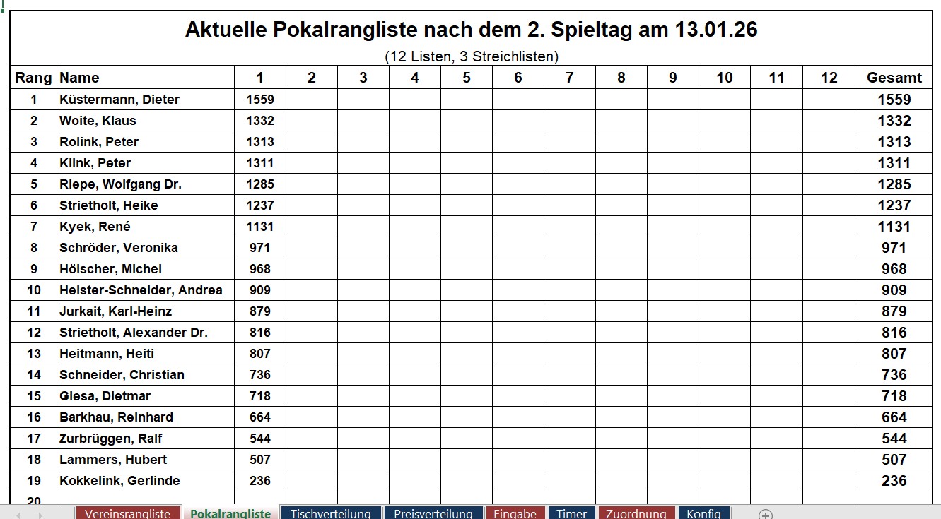 Pokalturnier: Neben der Klubmeisterschaft spielen wir auch einen Poklasieger aus. Die erste im Monat gespielte Liste ist die Pokalliste. Von den max. 12 Listen kommen die besten neun in die Wertung.
